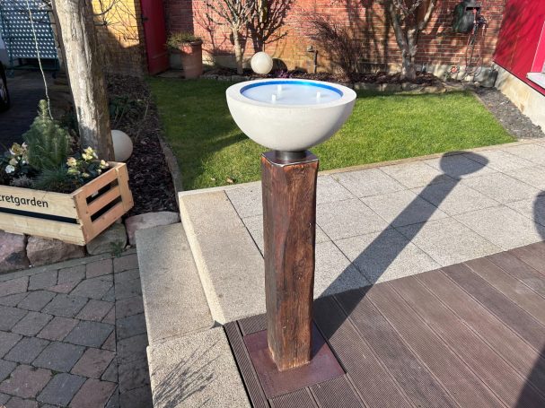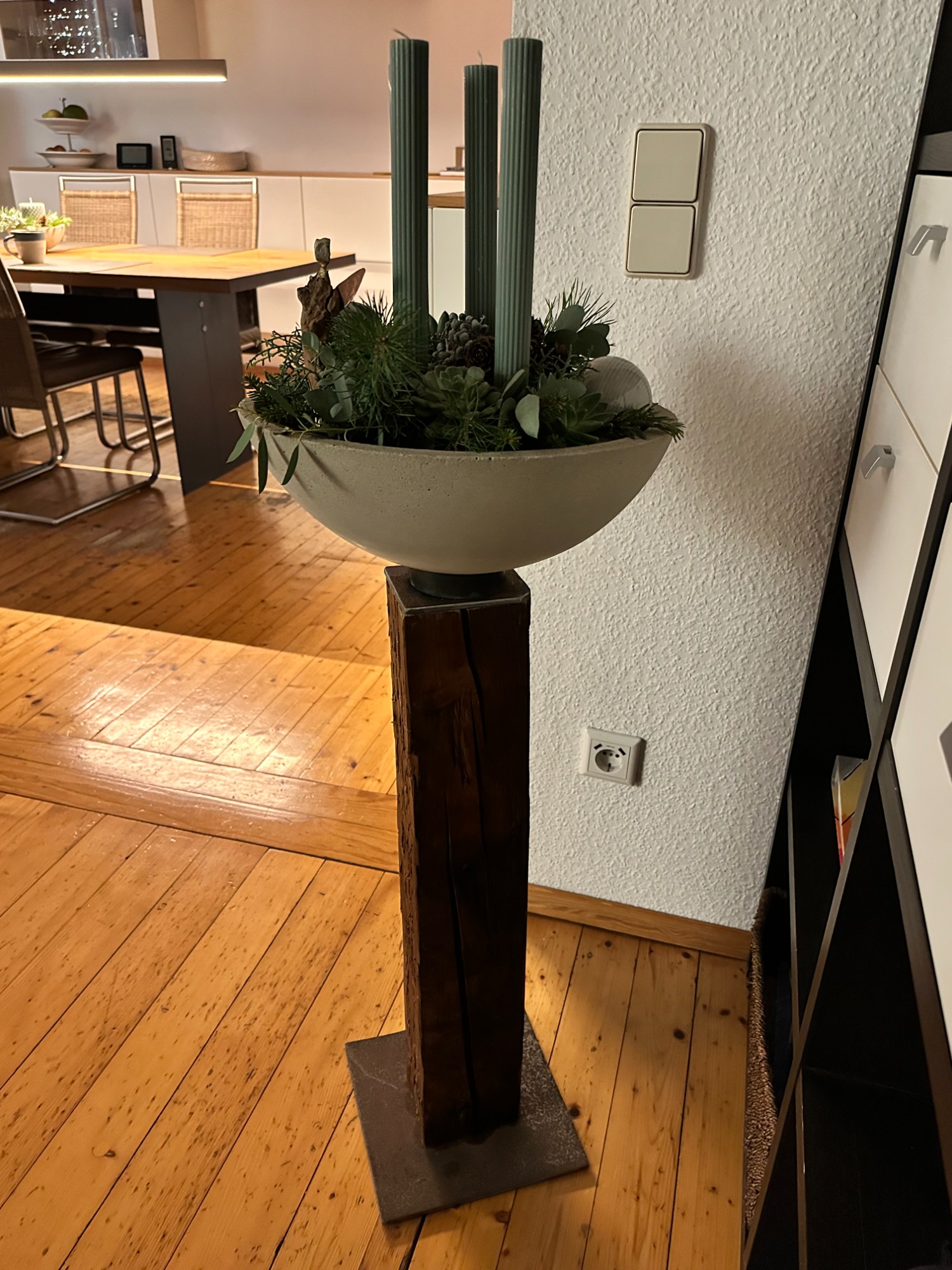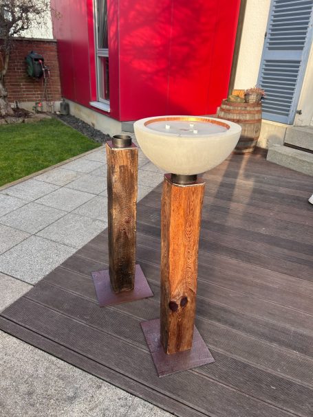 Die Stelen aus gebürstetem und geöltem Altholz setzen die Schalen oder Wachsfresserkeze dekorativ in Szene. Höhe zwischen 70cm und 90cm, je nach Querschnitt. Der Fuß istaus massivem Stahlblech gefertigt. An der Oberseite ist Zentrierring verschweißt, damit die Schale ausgerichtet werden kann. Alle Metallteile sind korrosiosgeschützt, weisen teilweise aber leichte Patina auf.