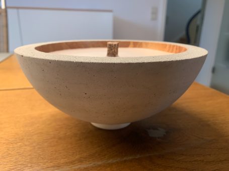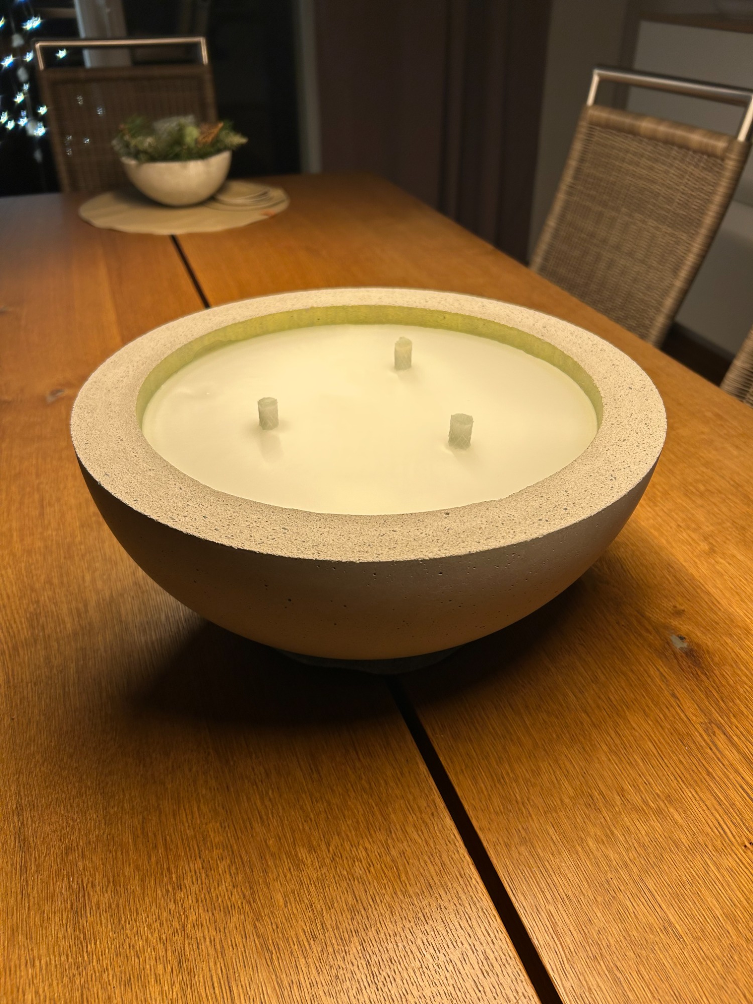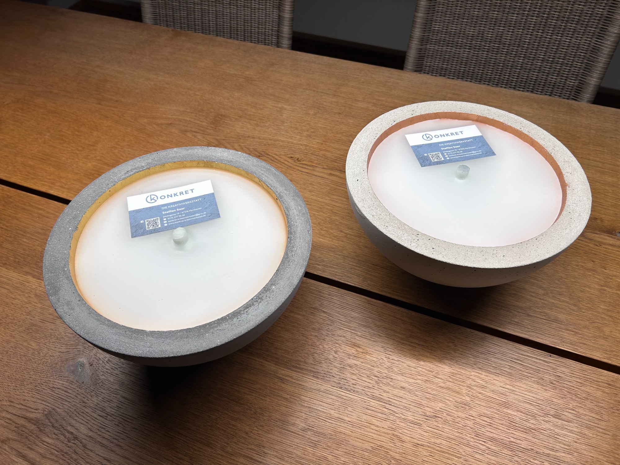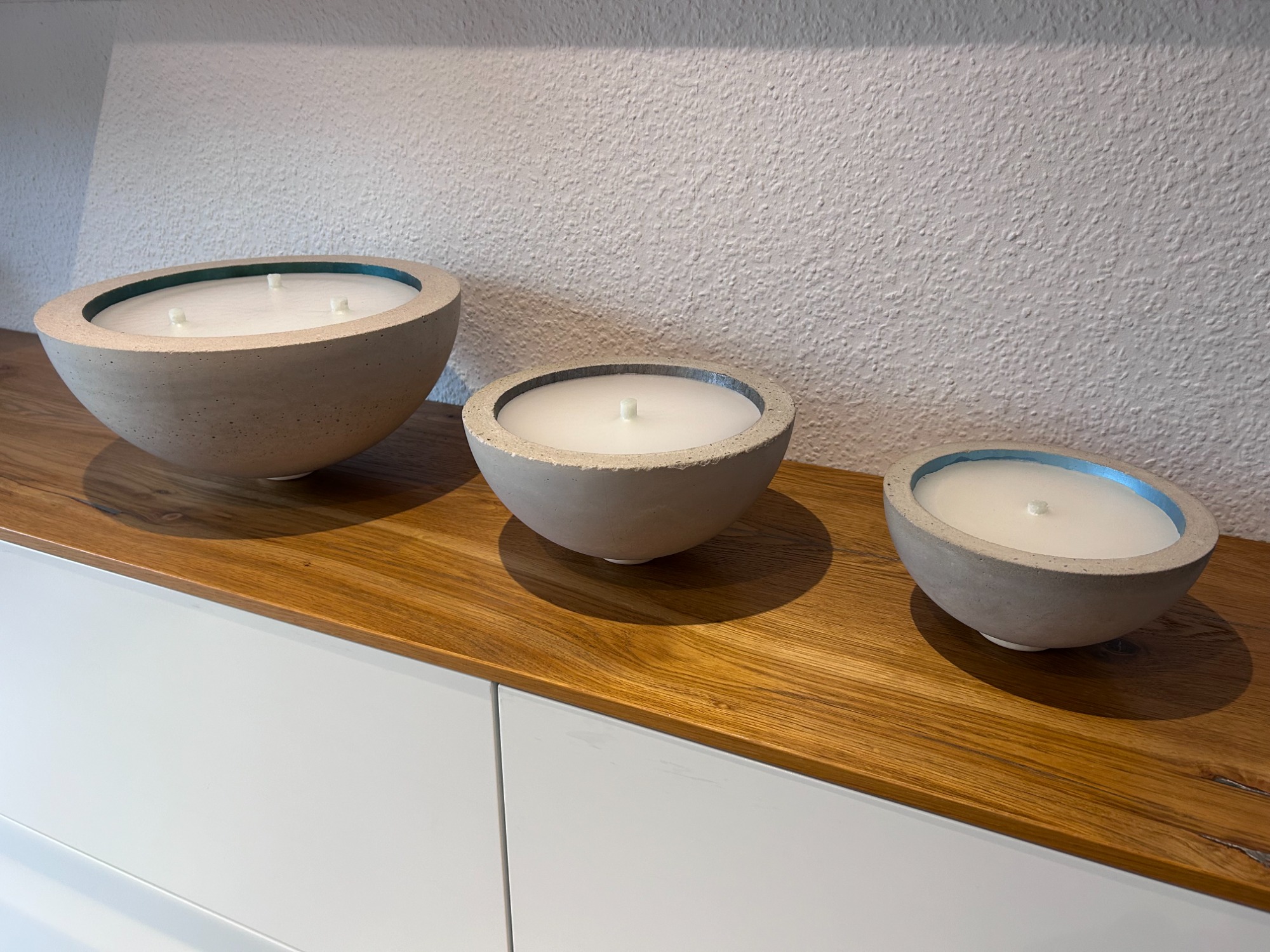 Handgefertigte Betonschalen in verschiedenen Metallic-Farben (gold, kupfer, rotgold, dunkelgrün, hellblau, dunkelblau, rosa, grüngold), gefüllt mit Paraffin-Wachs und Glasfaserdochten Dauerdochten.